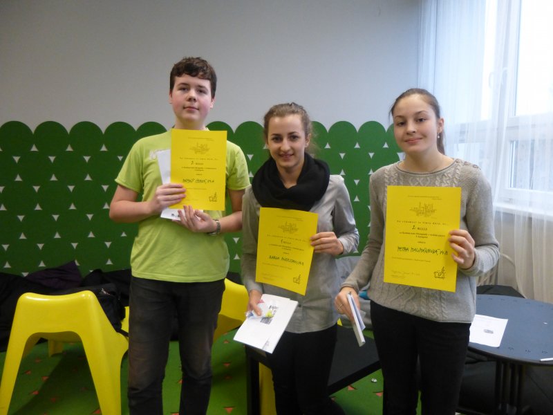 Dnes se konečně účastníci Olympiády v českém jazyce z I. kategorie dočkali a dozvěděli se, jak soutěž dopadla. První místo obsadila Karina Movsesjan z V4.B (26 bodů), druhé Petra Malimánková rovněž z V4.B (24,5 bodu) a třetí Matyáš Černý z V4.A (24 bodů). Soutěž byla výkonově velmi vyrovnaná a do okresního kola postupují soutěžící z prvních dvou míst. Blahopřejeme!