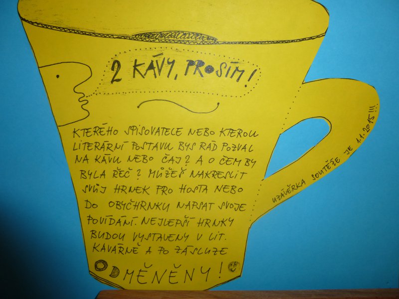 Lákalo by vás vypít si kávu se svým oblíbeným autorem nebo literární postavou? Podobnou fiktivní situaci zpracovávali naši studenti během prosince loňského roku v rámci literárně výtvarné soutěže "2 kávy, prosím". Ve výsledku jsme obdrželi více než 100 prací, které jsme nakonec rozdělili do několika kategorií: spíše výtvarné, ryze literární (zde vznikly dvě zajímavé mikropovídky) a literárně výtvarné. Zvláštní ocenění získaly dva příspěvky za originální zpracování zadání. Fotografie ze zahájení výstavy si můžete prohlédnout ve fotogalerii. Samotné úspěšné práce pak budou vystaveny v literární kavárně do konce února 2015. Všem přispěvatelům děkujeme a přejeme jim mnoho dalších skvělých nápadů a poutavých čtenářských zážitků!